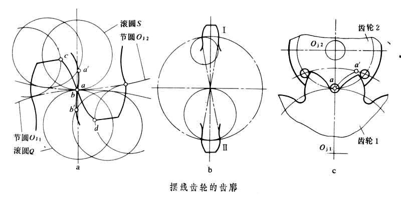 擺線齒輪的齒廓] )。滾圓S在節(jié)圓O外面滾動(dòng)形成齒頂曲線bc,在節(jié)圓O內(nèi)面滾動(dòng)形成齒根曲線aa;同樣,滾圓Q在O內(nèi)面滾動(dòng)形成齒根曲線bb,在O外面滾動(dòng)形成齒頂曲線ad。這樣的輪齒接觸傳動(dòng)相當(dāng)于一對(duì)大小為O和O的摩擦輪互相滾動(dòng)。擺線齒輪傳動(dòng)大多用于鐘表和某些儀器,與一般齒輪傳動(dòng)相比,它的特點(diǎn)是:①傳動(dòng)時(shí)一對(duì)齒廓中凹的內(nèi)擺線與凸的外擺線嚙合,因而接觸應(yīng)力小,磨損均勻;②齒廓的重合度較大,有利于彎曲強(qiáng)度的改善;③無(wú)根切現(xiàn)象,最少齒數(shù)不受限制,故結(jié)構(gòu)緊湊,也可得到較大的傳動(dòng)比;④對(duì)嚙合齒輪的中心距要求較高,若不能保證輪齒正確嚙合,會(huì)影響定傳動(dòng)比傳動(dòng);⑤這種傳動(dòng)的嚙合線是圓弧的一部分,嚙合角是變化的,故輪齒承受的是交變作用力,影響傳動(dòng)平穩(wěn)性;⑥擺線齒輪的制造精度要求較高。