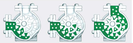 高粘度泵是內(nèi)齒輪泵回轉(zhuǎn)式正位移泵,液體流動(dòng)由兩個(gè)齒輪產(chǎn)生,主動(dòng)齒輪和從動(dòng)輪,內(nèi)齒輪嵌在外齒輪里面,由一個(gè)月牙擋板隔開.當(dāng)齒輪轉(zhuǎn)動(dòng)時(shí),液體被吸入到兩個(gè)齒輪和月牙擋板圍成的空間里,當(dāng)齒輪嚙合時(shí), 液體受壓被排除泵外. 因此, 液體流動(dòng)平穩(wěn) , 并且容量大, 結(jié)構(gòu)緊湊.