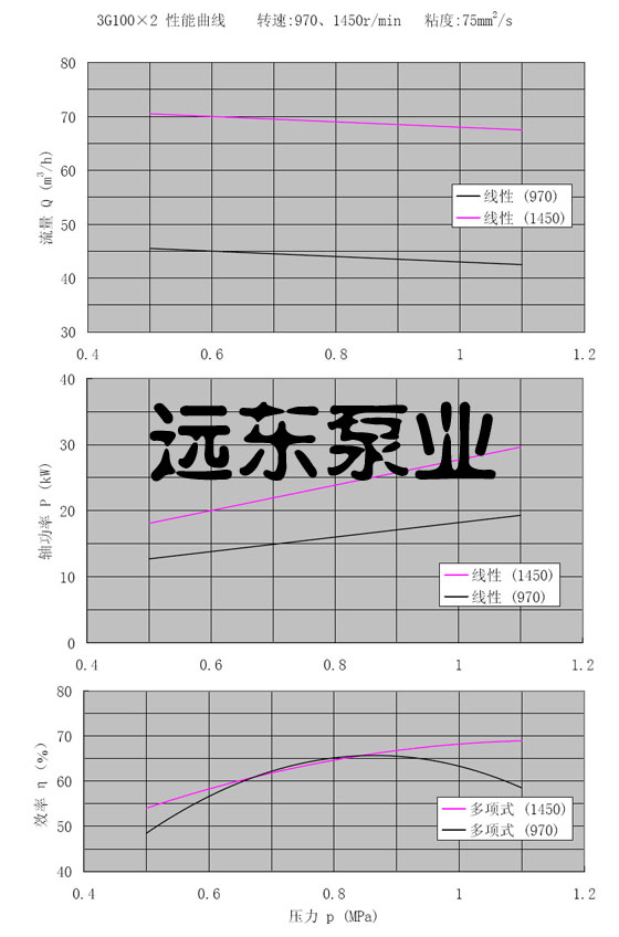 3GR100*2三螺桿泵轉(zhuǎn)速970,1450r/min,粘度75cst下性能曲線圖