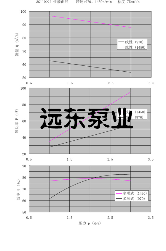 3GR110*4三螺桿泵轉(zhuǎn)速970,1450r/min,粘度75cst性能曲線圖